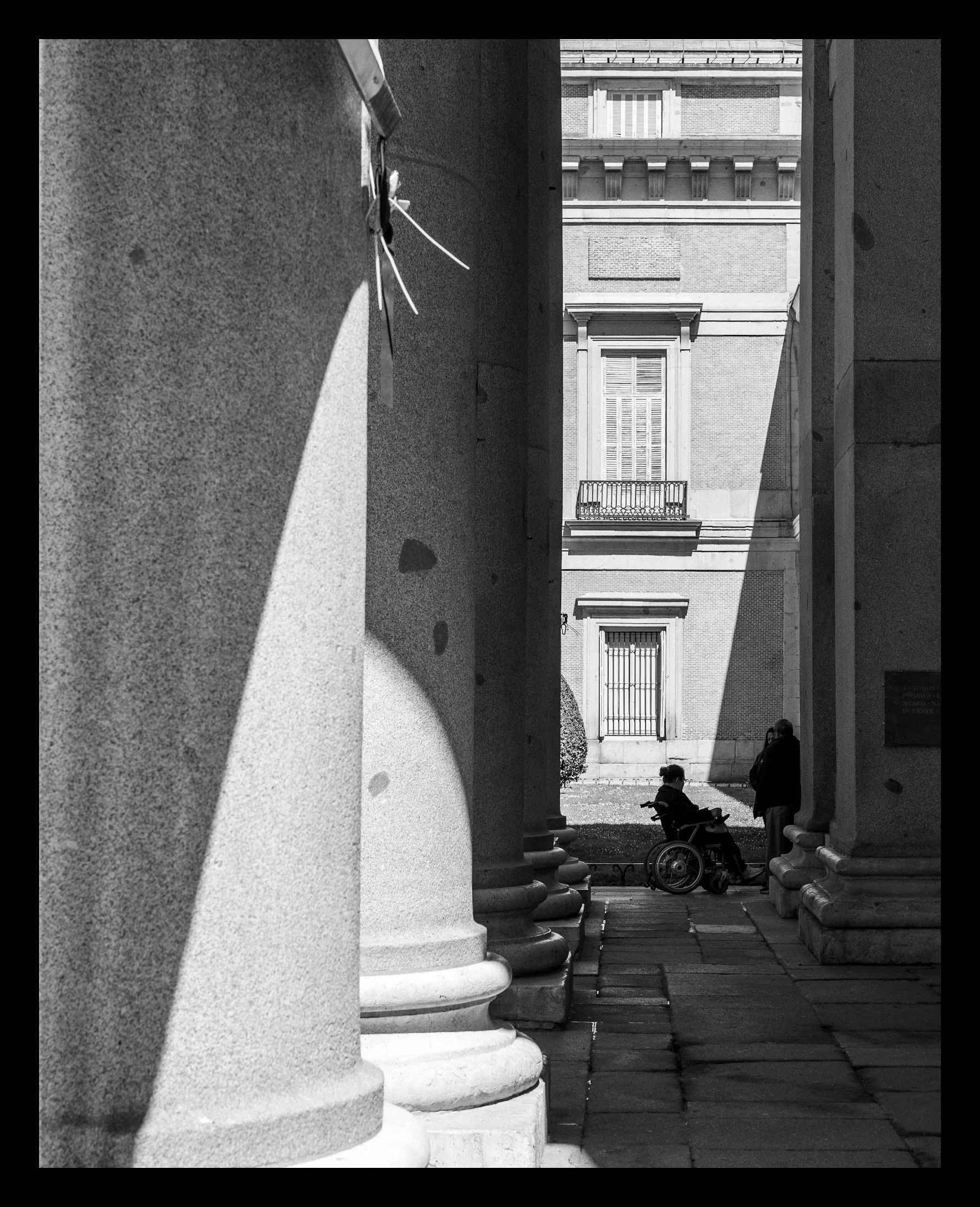 In this moment, framed by columns and shadow, two lives pause in quiet connection. One seated, one standing… both held in the stillness of light cutting through space.