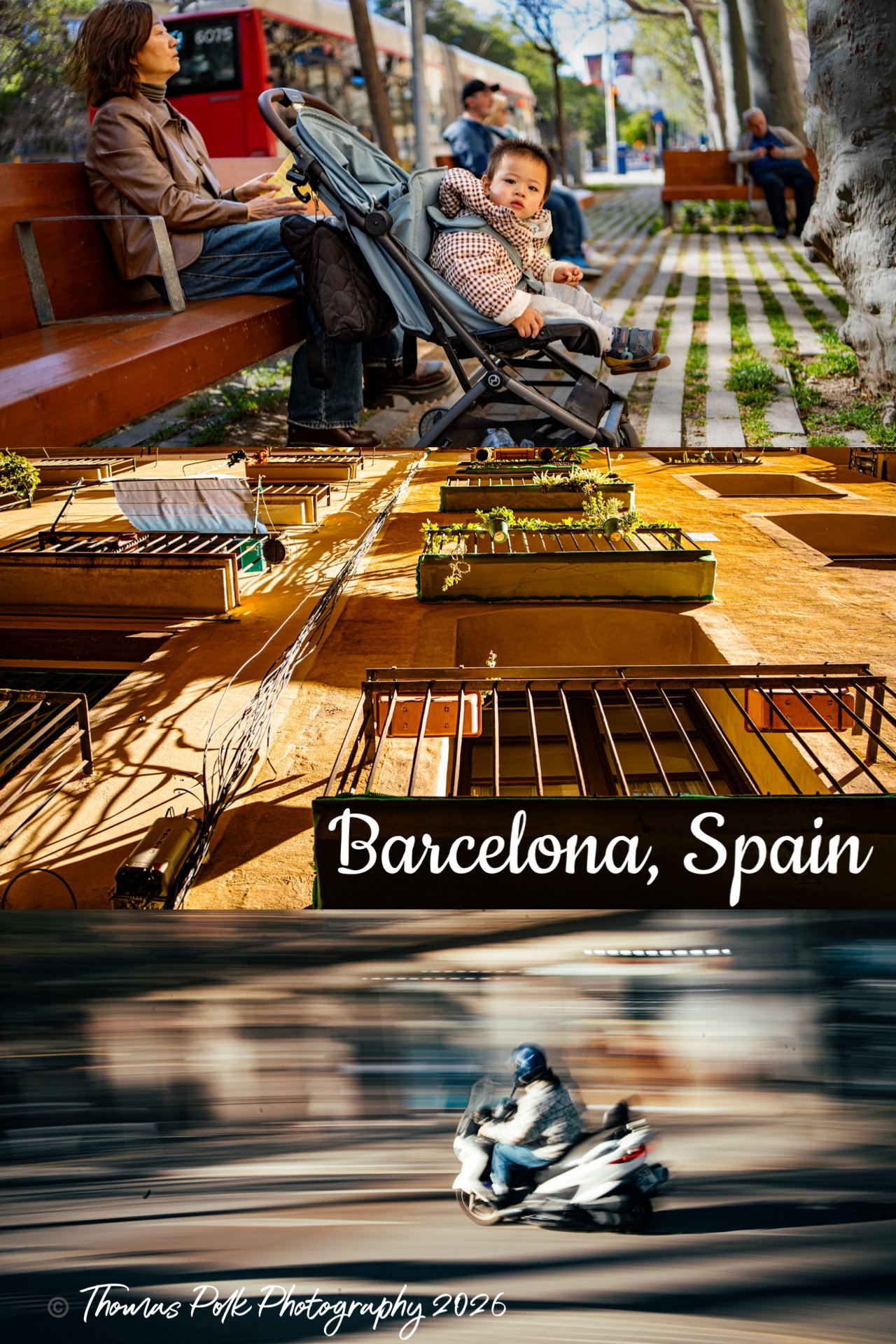 A child watching the world, a rider passing through it—two rhythms of the same city.
